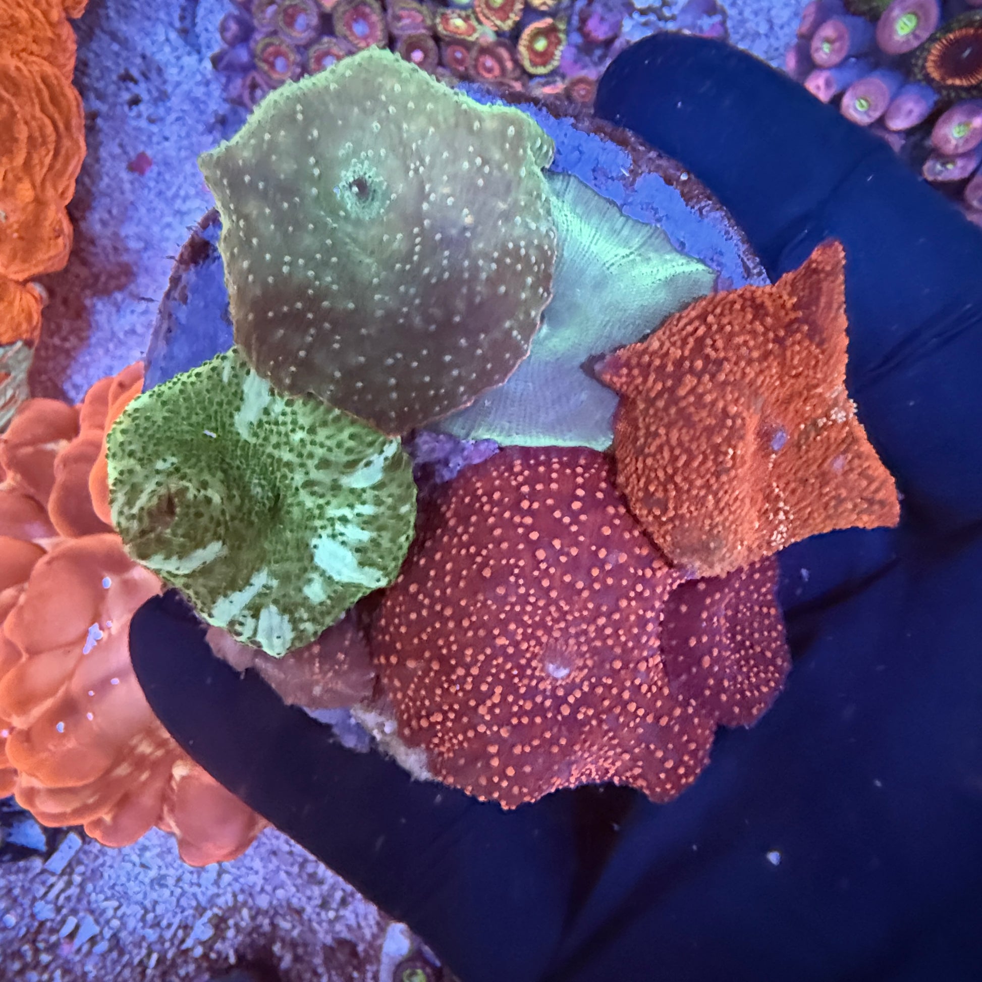 Mushroom corals are hardy, soft corals loved for their smooth, fleshy caps and wide range of vibrant colors, including reds, greens, blues, and multicolor patterns. Easy to care for and adaptable, they thrive in low to moderate light and gentle flow, making them perfect for beginners and seasoned reef keepers alike. Mushrooms add rich color and natural movement to reef tanks and can slowly spread, creating a lush, living carpet over time.