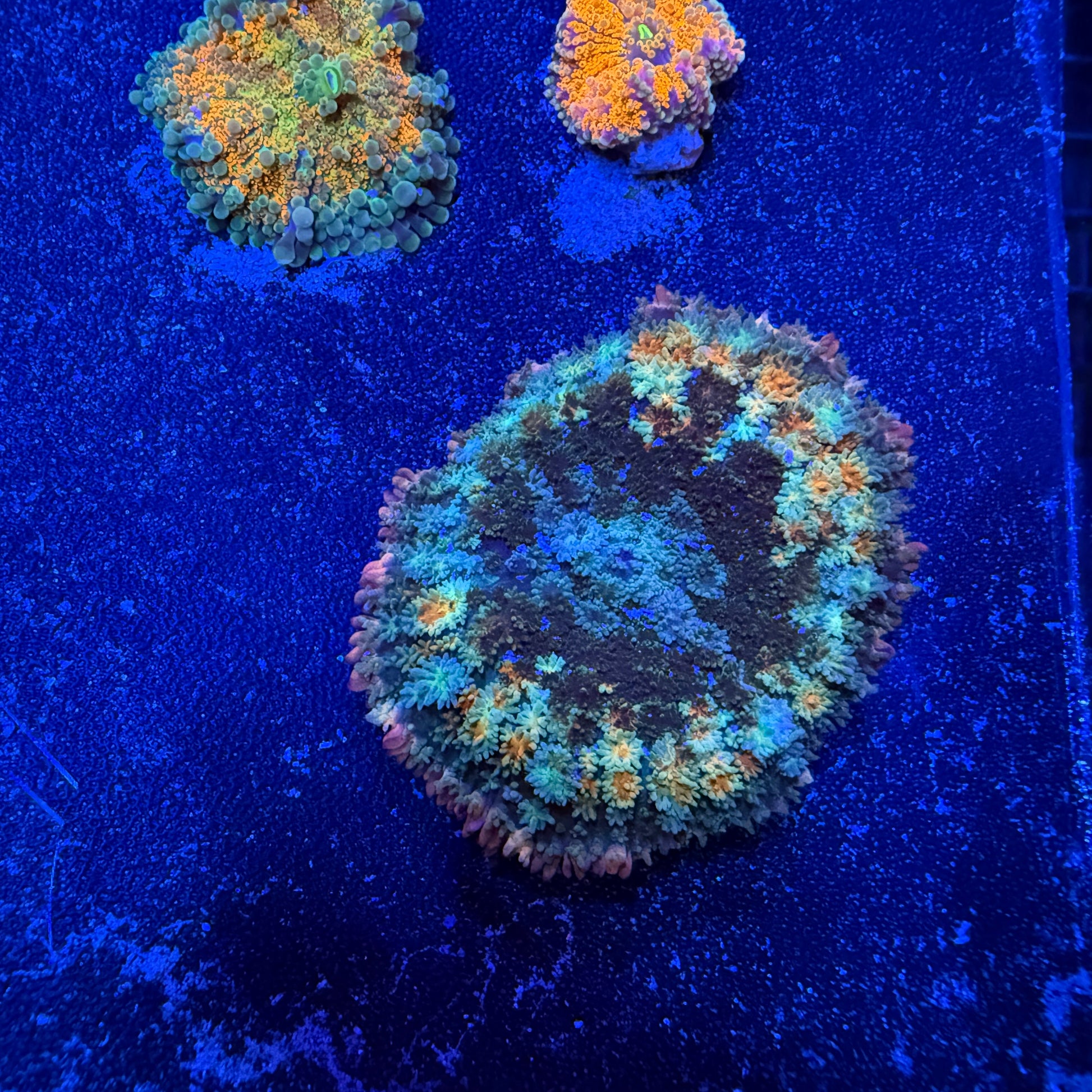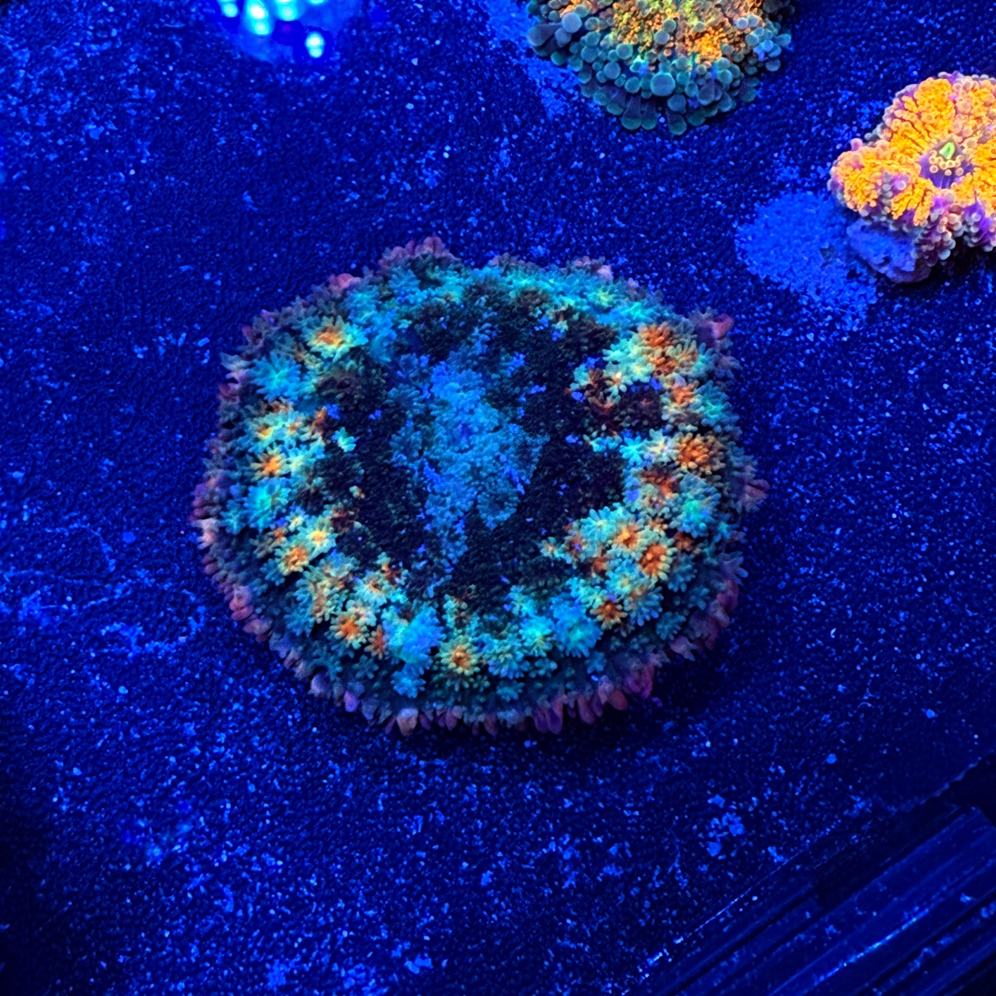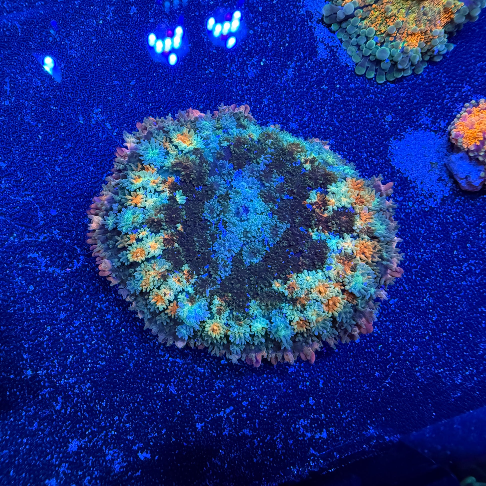 Frankie’s Bride is a vibrant mushroom coral known for its striking blend of neon greens, pinks, and purples that glow intensely under blue light. Its smooth, rounded cap and bold coloration make it an eye-catching addition to any reef tank. Hardy and easy to care for, it thrives in low to moderate light and gentle flow, spreading naturally over time.