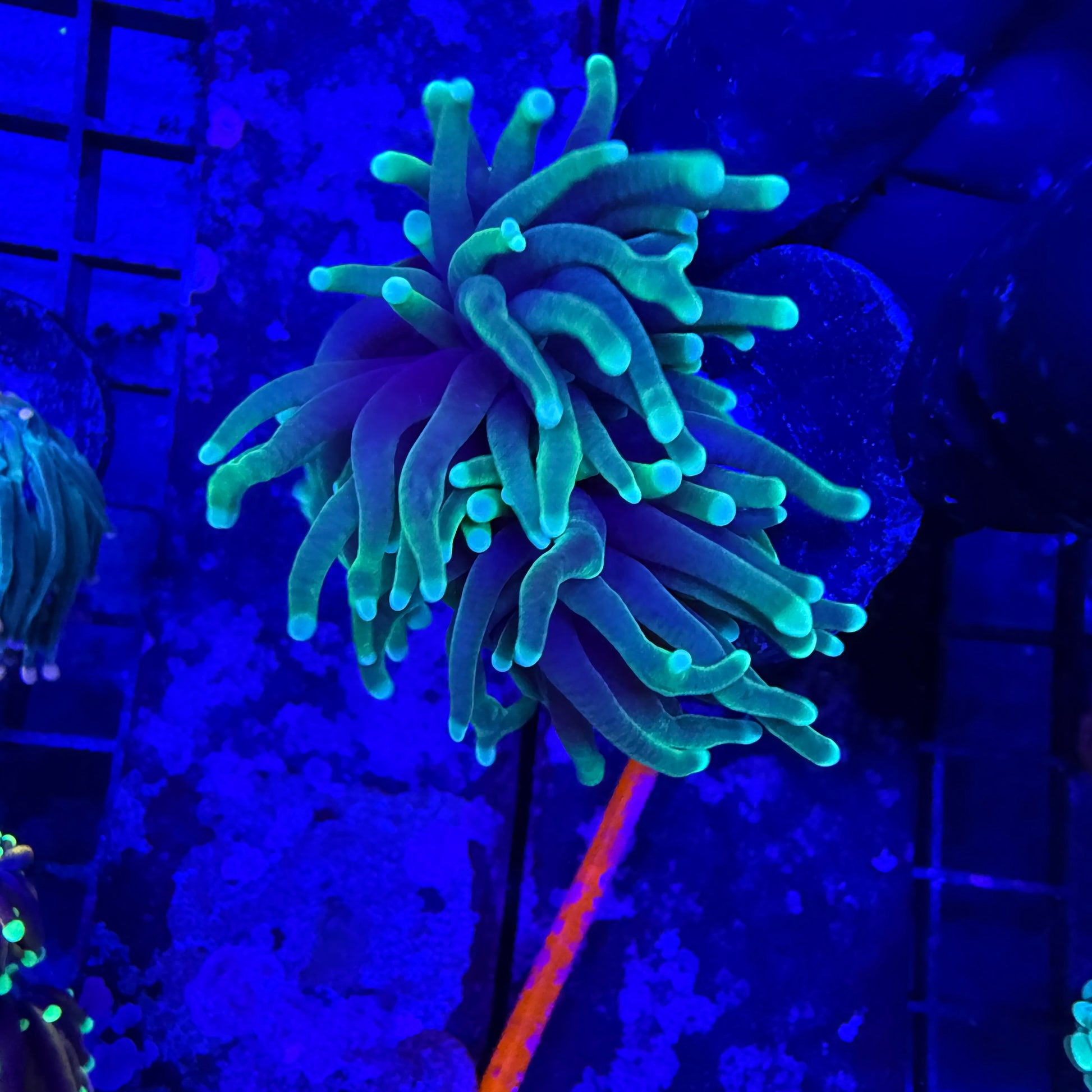 Torch coral, also known as Euphyllia glabrescens, is a popular species of large polyp stony coral prized by marine aquarists for its striking appearance and relatively hardy nature. This coral is characterized by its long, flowing tentacles, which can be various shades of green, brown, or yellow, often with contrasting tips in colors like white or purple. These tentacles resemble the flickering flames of a torch, hence the name.