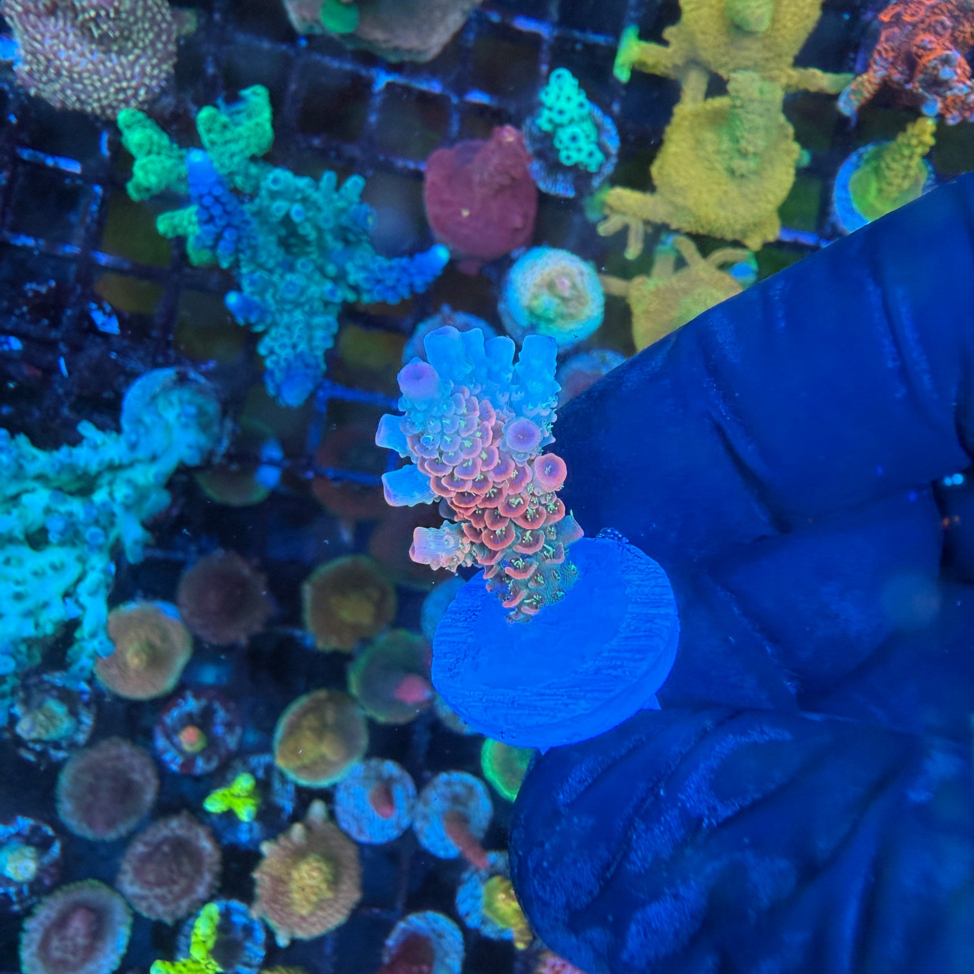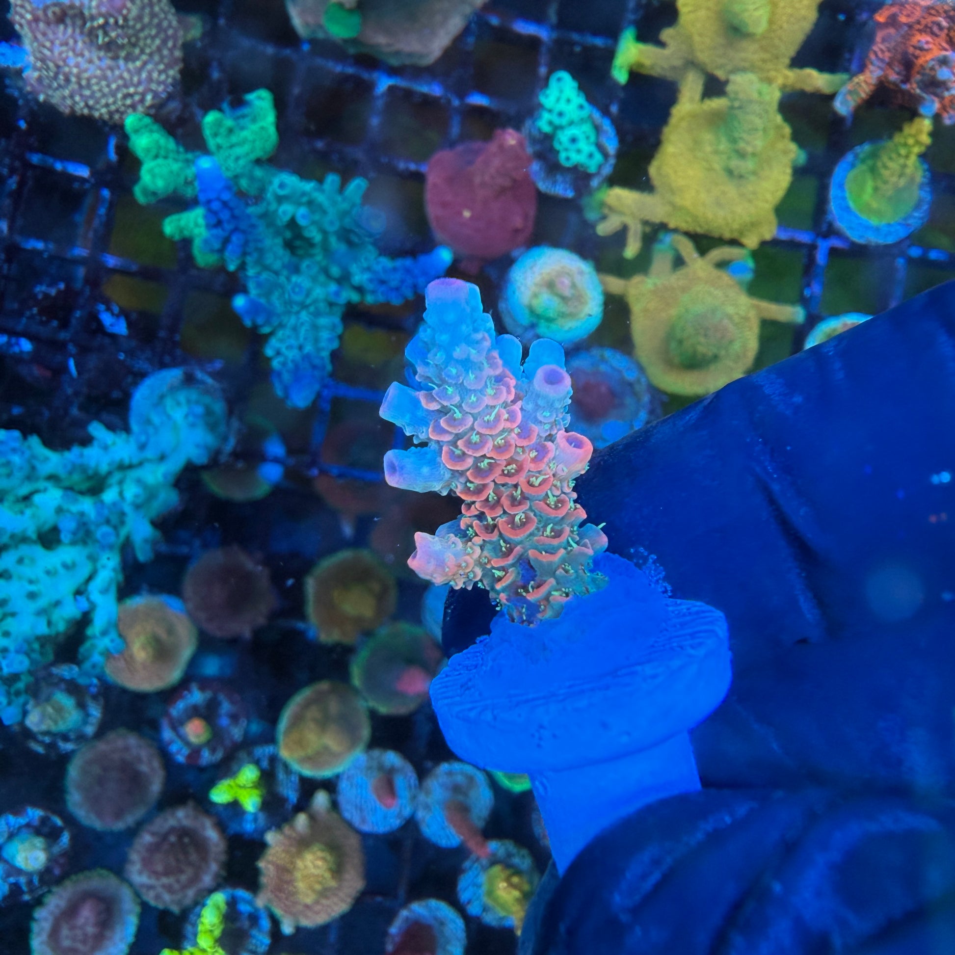 ASD Rainbow Millepora is a striking SPS coral featuring vibrant orange branches contrasted by bright green polyps. Its fine, delicate structure and constant polyp extension give it a fuzzy, glowing appearance under reef lighting. Fast-growing in stable systems, this Millepora thrives under strong light and moderate to high flow, making it a bold, eye-catching addition to any SPS-dominant reef.