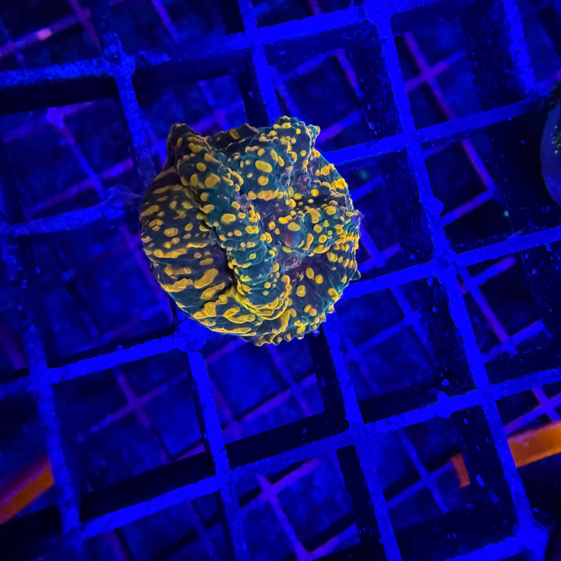 Chalice corals are vibrant, plate-like LPS corals known for their swirling patterns and bold splashes of color—ranging from neon greens and reds to blues, purples, and rainbow combinations. Their surface has a smooth, undulating texture with small, inset eyes that add depth and character. Chalices thrive in low to moderate light and gentle flow, rewarding stable conditions with steady growth and intense coloration. A true statement piece for any reef tank.