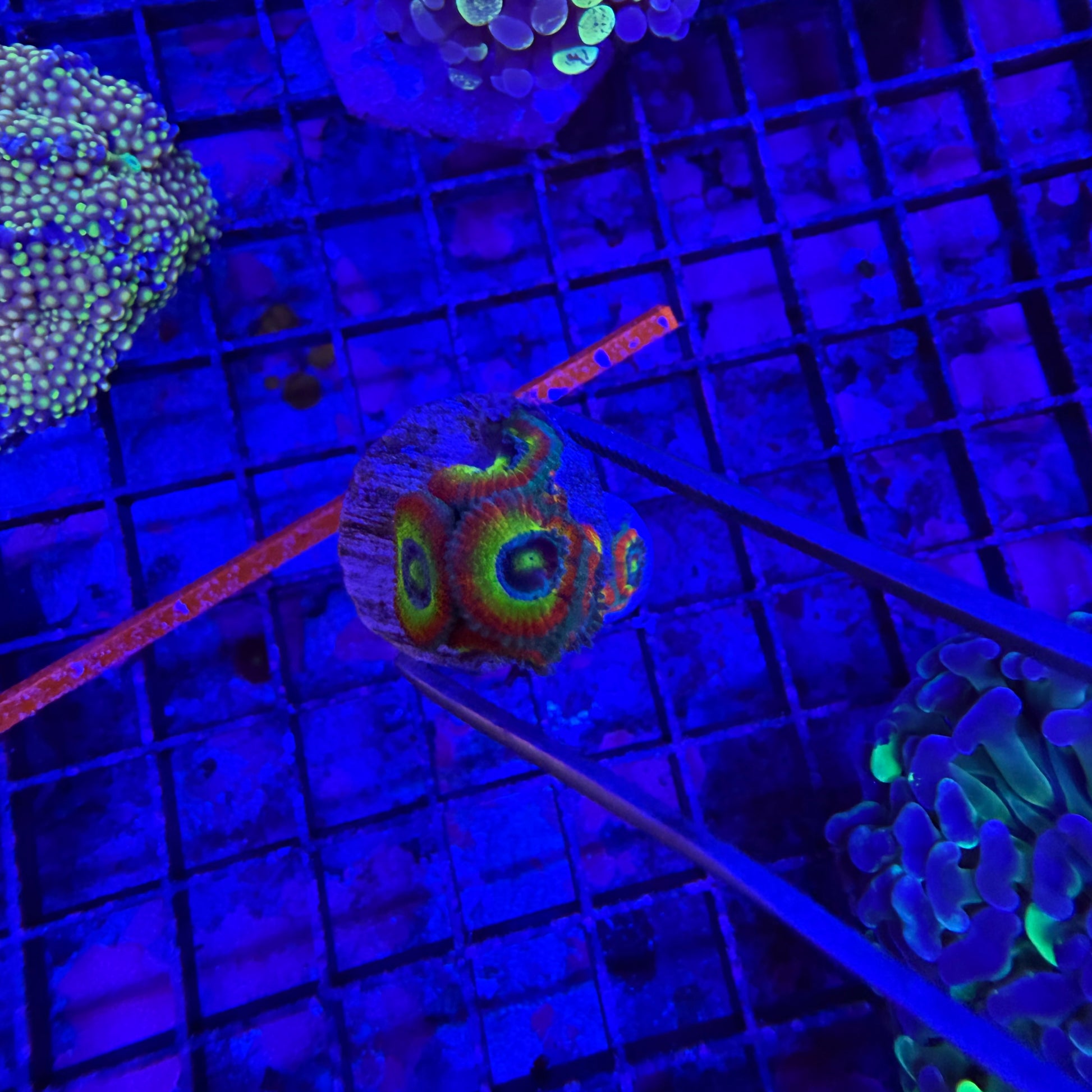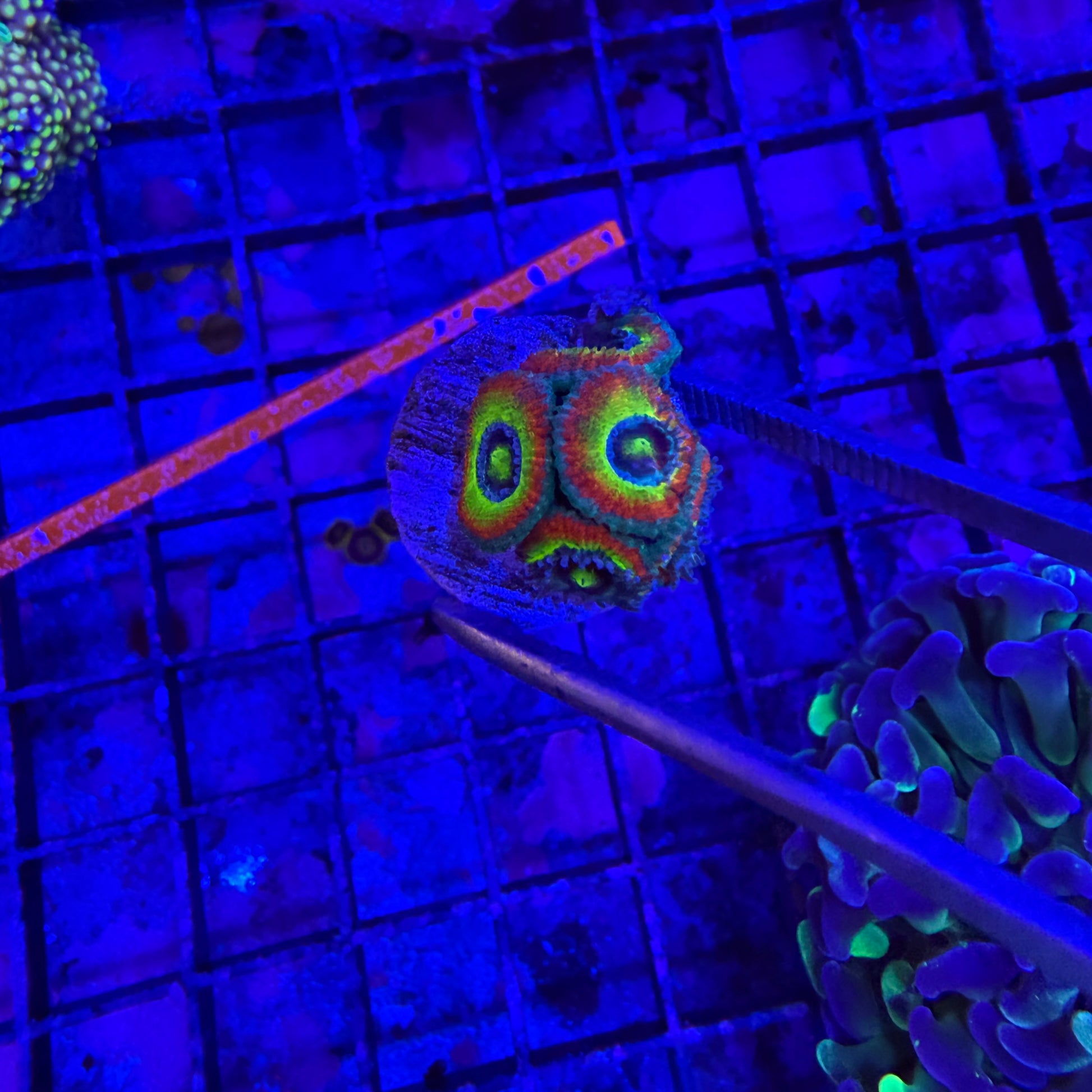Holy Grail Micromussa is a high-end LPS coral prized for its intense neon green base contrasted by bright orange, red and blue. Strong fluorescence and rich coloration make it a true collector centerpiece.