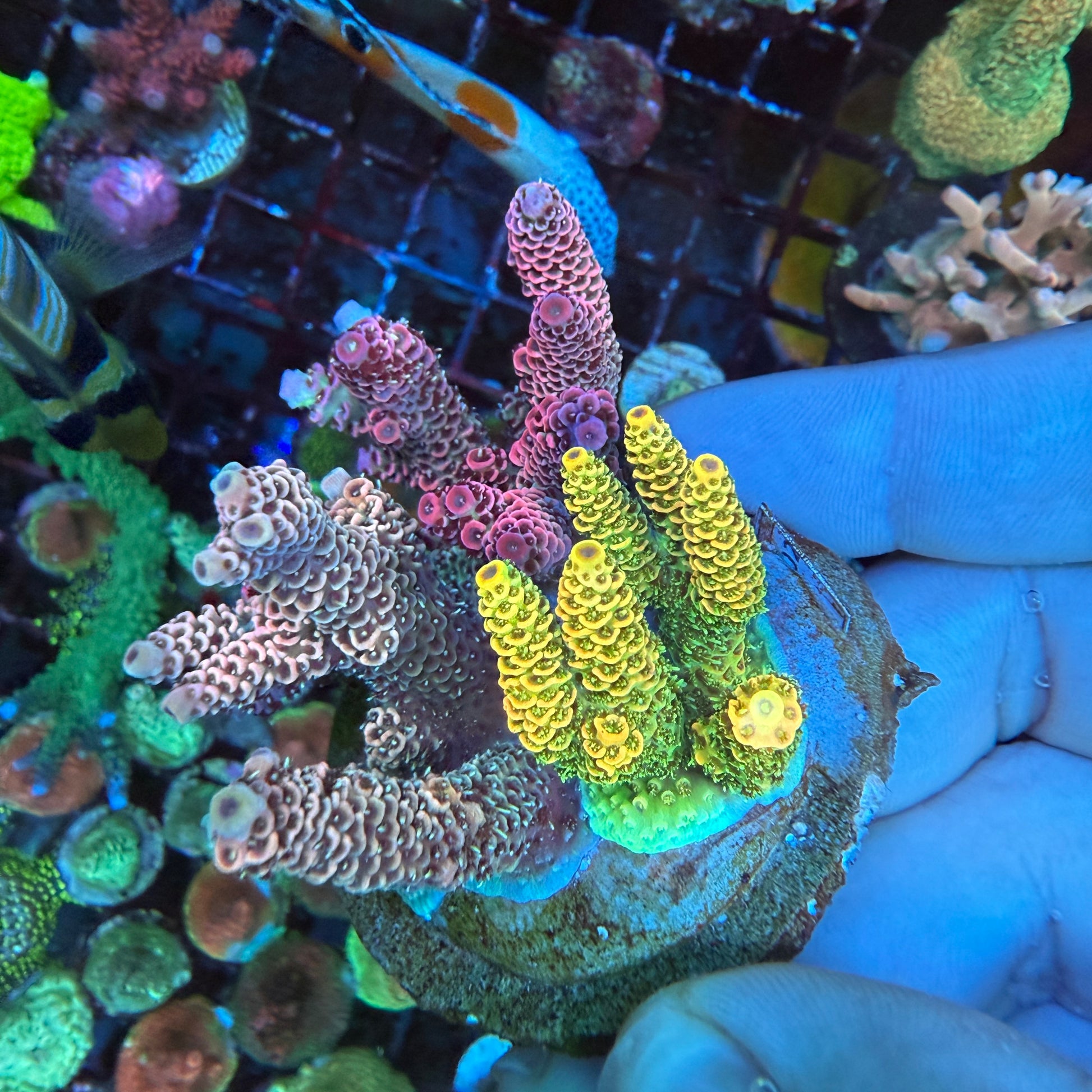 Millepora corals are fast-growing SPS favorites prized for their fine, fuzzy polyps and vibrant coloration ranging from neon greens and teals to pinks and purples. Their delicate branching structure adds height and texture, while constant polyp extension gives them a lively, shimmering look. Best suited for stable reef systems, Millepora thrive under strong lighting and moderate to high flow, rewarding experienced reefers with rapid growth and intense color.