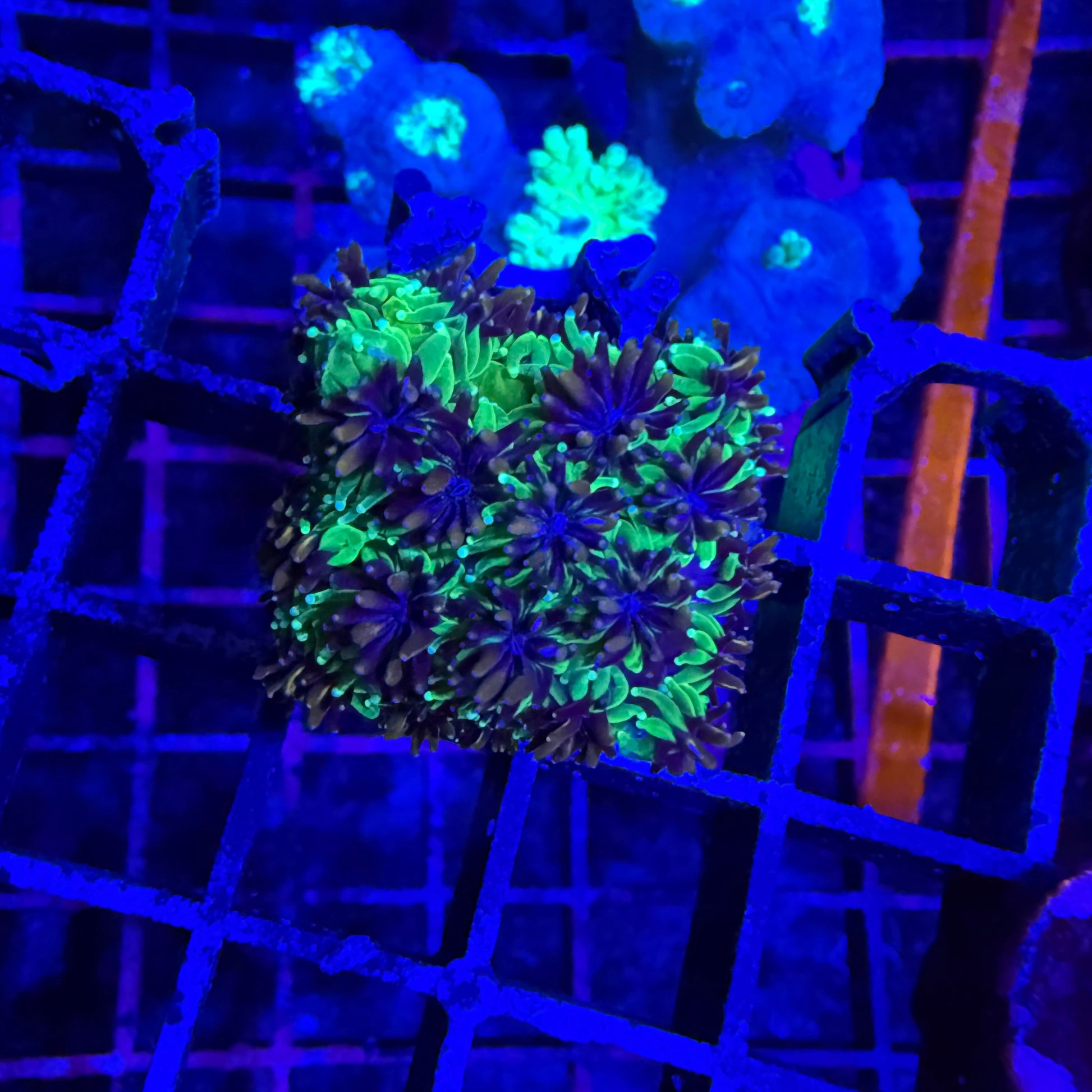Galaxea coral is a dazzling LPS species known for its star-like polyps that glow brilliantly in greens, golds, and whites. Each branch is covered in sharp, delicate tentacles that create a shimmering, galaxy-like effect under blue light. Though hardy and fast-growing, Galaxea is famous for its long sweeper tentacles, so it needs extra space from neighbors. With the right room and moderate light and flow, it becomes a stunning, radiant showpiece in any reef.