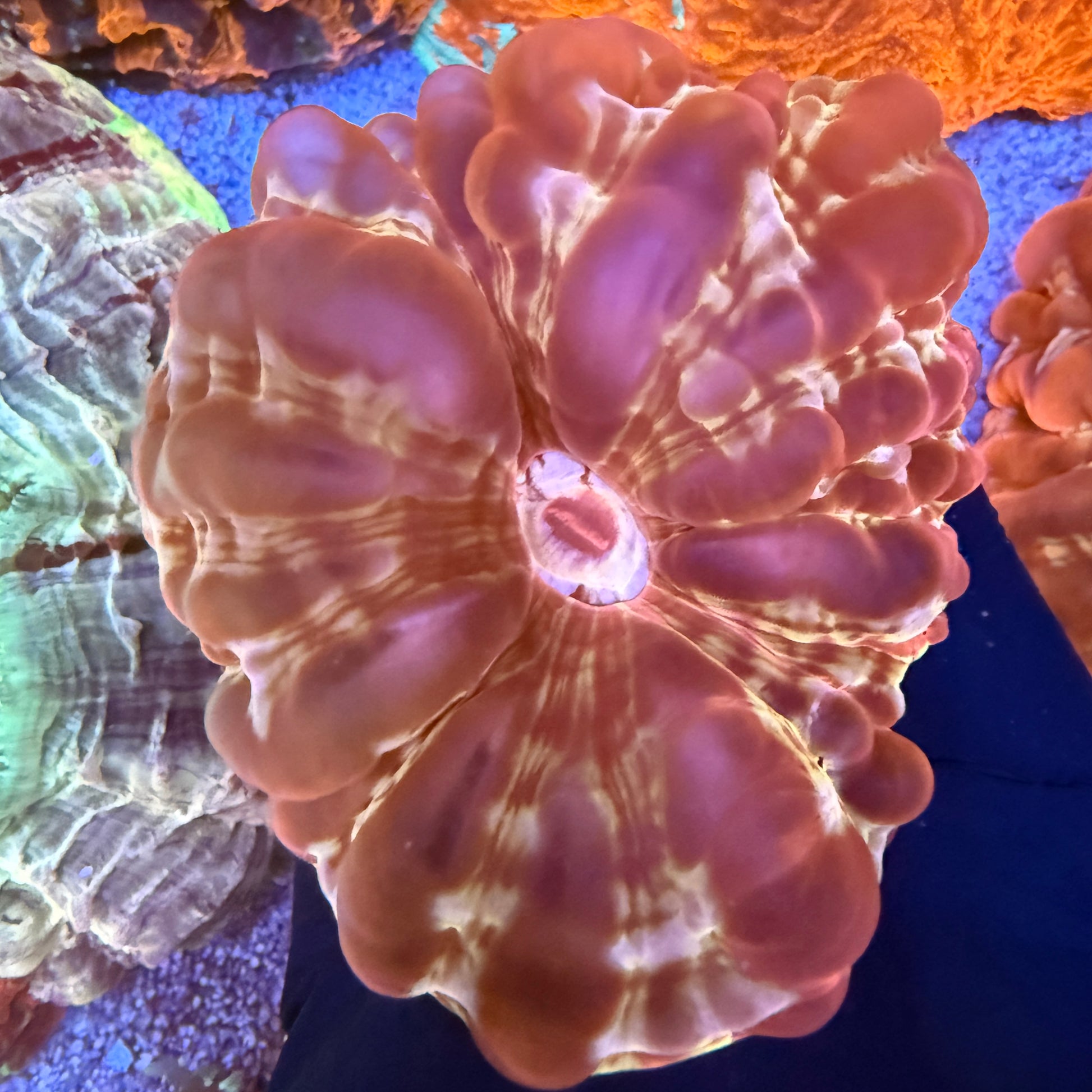 Cynarina is a striking LPS coral known for its large, fleshy polyp and dramatic, inflated appearance. It often displays rich, glossy colors such as deep reds, greens, oranges, and metallic hues that shimmer under reef lighting. Peaceful and eye-catching, Cynarina prefers low to moderate light and gentle flow, making it ideal for the sandbed. With stable conditions and occasional feeding, it becomes a bold, living centerpiece in any reef tank.