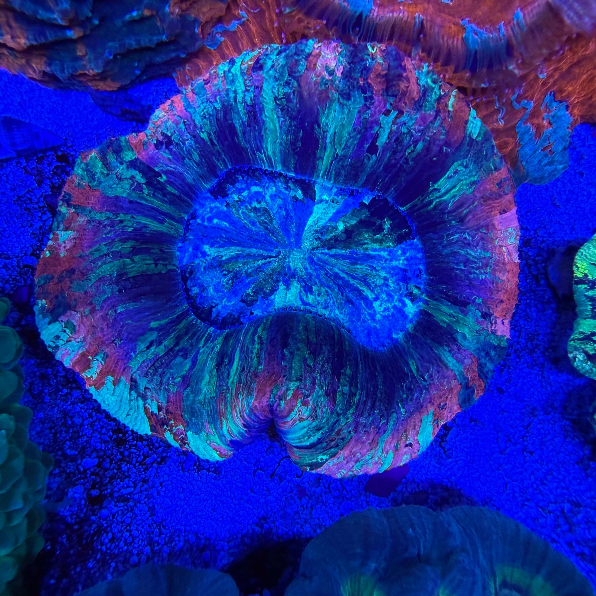Stunning Ultra Trachyphyllia featuring bold coloration, fleshy tissue, and excellent expansion. This eye-catching LPS coral adds vibrant color and a dramatic presence to any reef aquarium, especially under blue lighting.