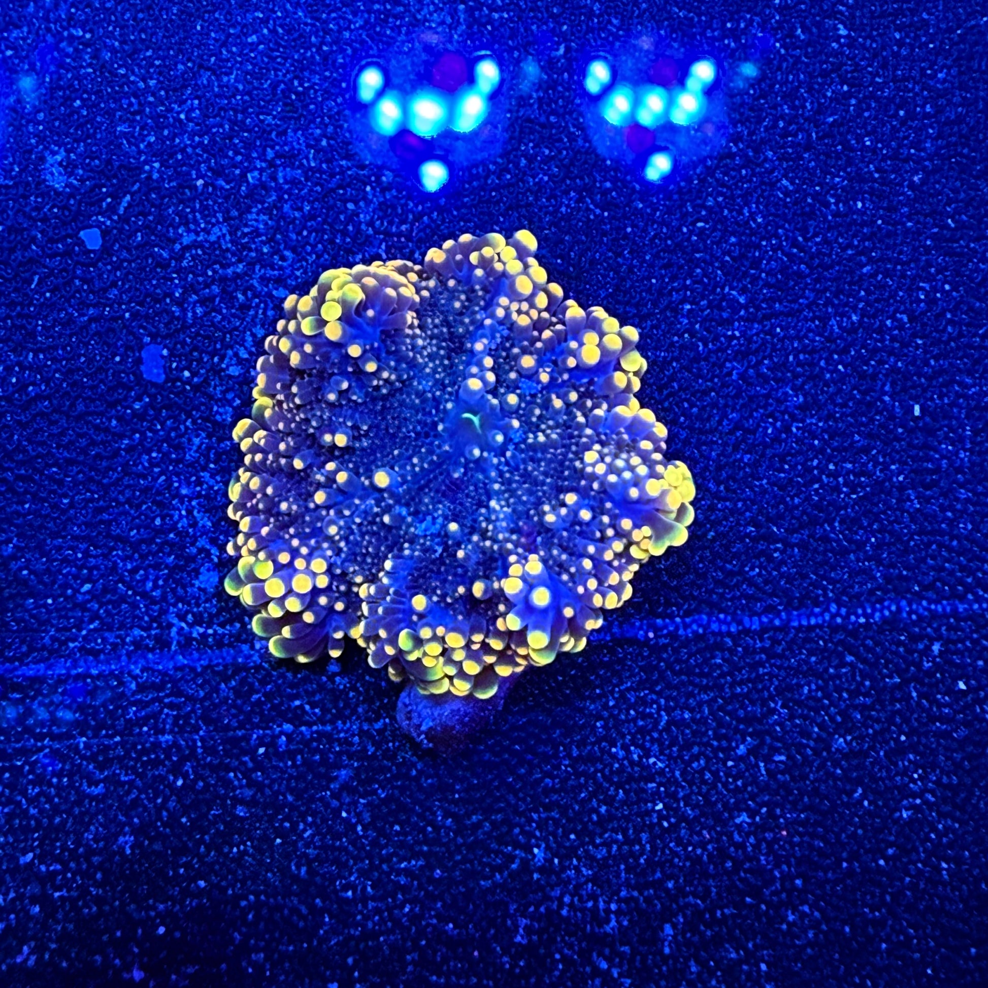 Yuma mushrooms are prized for their bubbly, textured surface and intense coloration, often showing radiant oranges, greens, and blues that pop under actinic lighting. Unlike smooth mushrooms, Yumas are covered in small nodules that give them a unique, almost “beaded” appearance. They prefer moderate light and gentle flow, and can become a standout centerpiece in any reef tank thanks to their vivid, eye-catching glow.