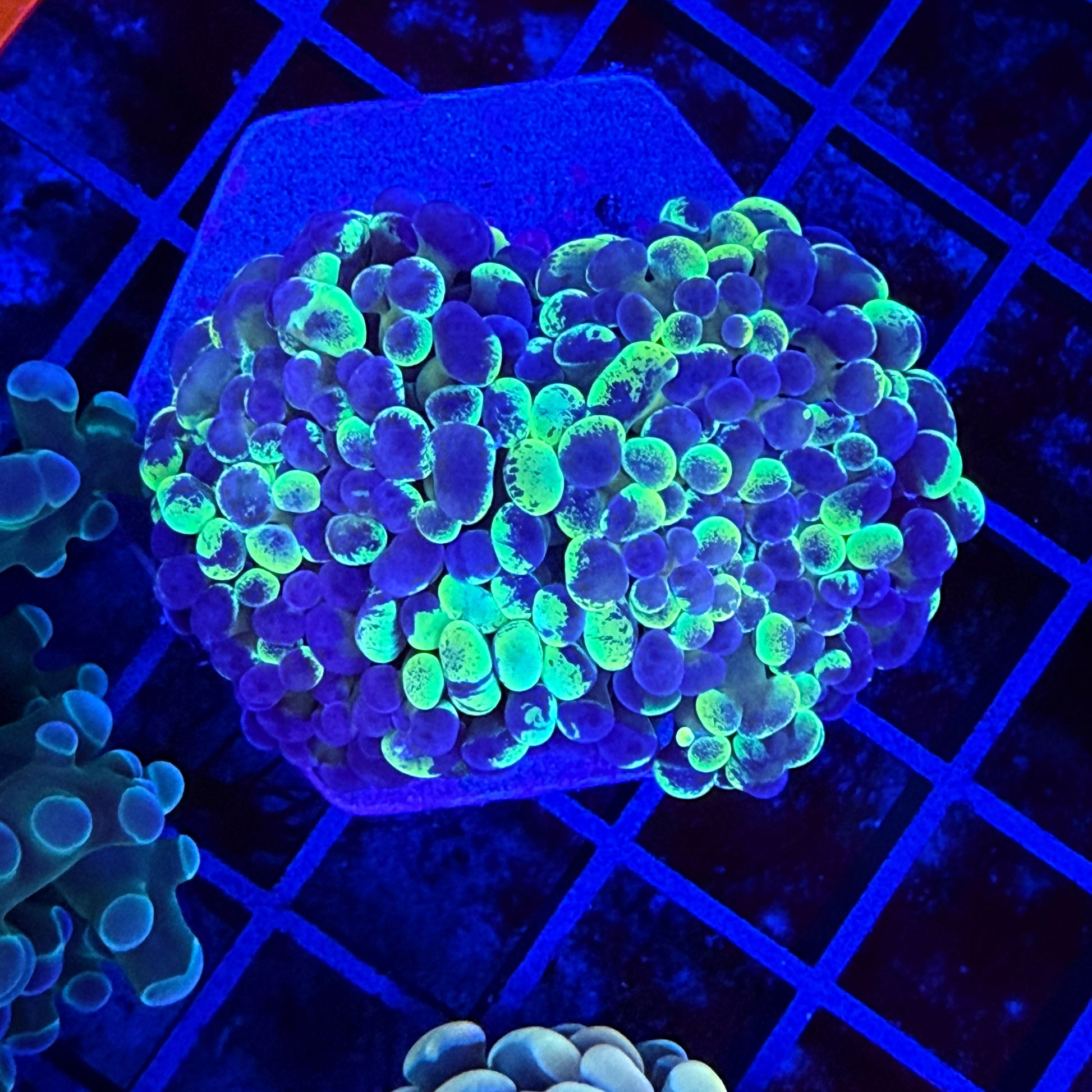 Native to the Indo-Pacific region, hammer coral is typically found in shallow reef environments where it thrives under moderate lighting and water flow conditions. In an aquarium setting, it prefers stable water parameters, with an optimal temperature range of 72-78°F, a pH of 8.1-8.4, and a calcium level of 400-450 ppm. This coral's hardy nature makes it a suitable choice for both beginner and experienced aquarists.